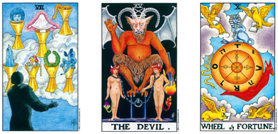 스핑크스와 야누비스는 죽은 자의 수호신이며 이 수레는 더 나은 쪽으로 전환과 전생부터 인연이 있는 것을 의미한다.